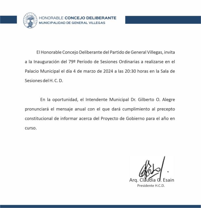 El Honorable Concejo Deliberante del Partido de General Villegas, invita a la Inauguración del 79º Período de Sesiones Ordinarias a realizarse en el Palacio Municipal el día 4 de Marzo de 2024 a las 20:30 horas en la Sala de Sesiones del H. C. Deliberante. En dicha sesión inaugural el Señor Intendente Municipal Dr. Gilberto O. Alegre pronunciará el mensaje anual con el que dará cumplimiento al precepto constitucional de informar acerca del Proyecto de Gobierno para el año en curso.